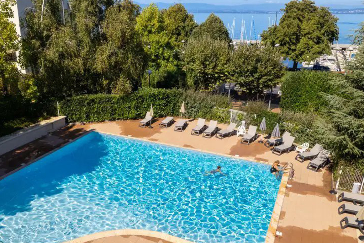 » Centre aquatique « Évian Plage » en bord de lac sur 3,5 ha de pelouse avec 2 piscines chauffées, plongeoirs et jeux aquatiques.